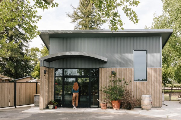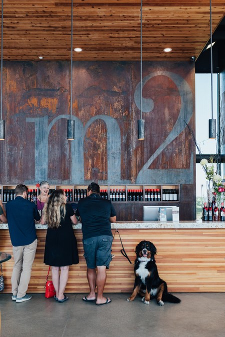 The indoor/outdoor space truly shines when those massive doors open up, blurring the line between the tasting room and the surrounding vineyard. Solar panels top the energy-efficient facility, while the open design creates comfortable space for both two- and four-legged guests to settle in and enjoy the experience.